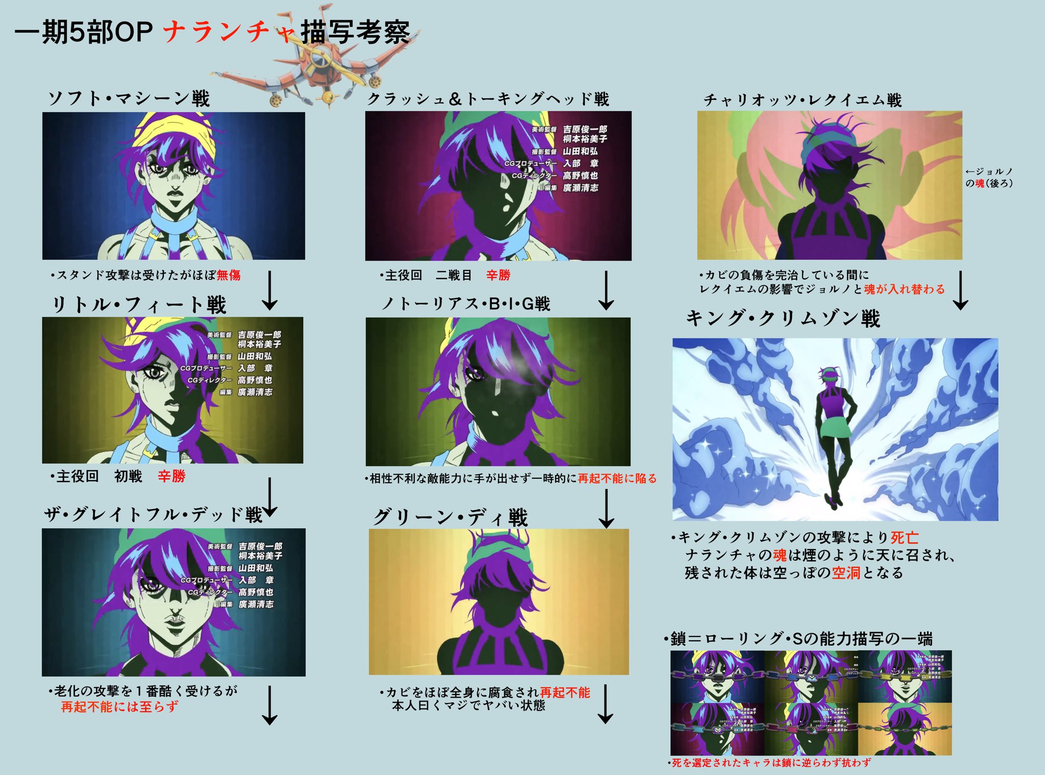 剣豪 1期opでのナランチャ描写考察まとめ 映像内の連続7カットは初登場から死亡までのナランチャの戦いの伝記で 影が濃くなるほど精神が不安定 生命の危機 最後の背を向けてるナランチャは既に空っぽの空洞で魂が煙のように抜け天に召される図